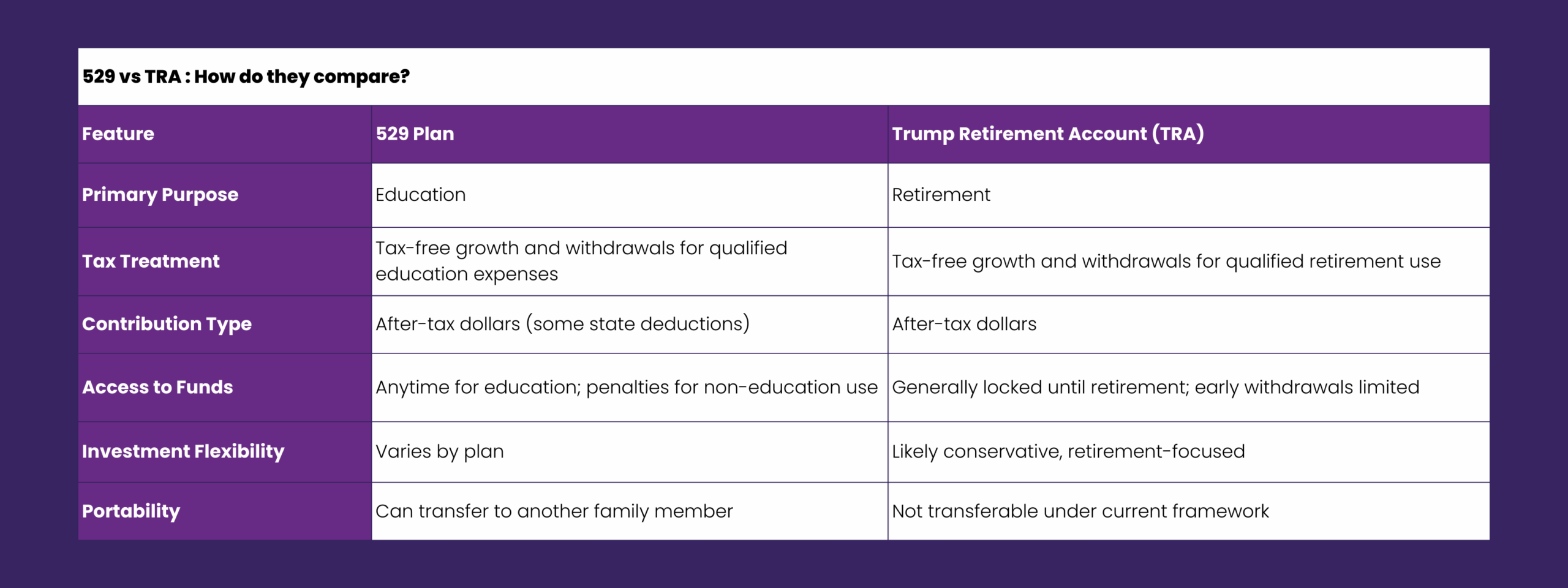 While both the 529 and TRA are tax-advantaged savings vehicles that allow for long-term growth, they serve very different purposes. The 529 plan is focused on education, with flexibility for a range of schooling expenses but penalties for non-qualified withdrawals. The TRA, on the other hand, is intended for retirement and may be off-limits until your child reaches 59½.